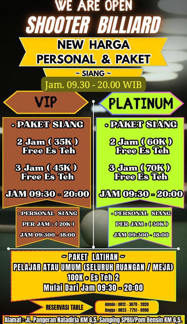 Shooter Biliar menyediakan Paket Siang dan Malam bagi para pemain. Dimana paket siang terdiri dari pukul 09.30 sd 20.00 WIB sedangkan paket malam terdiri dari pukul 18.00 sd 03.00 WIB.