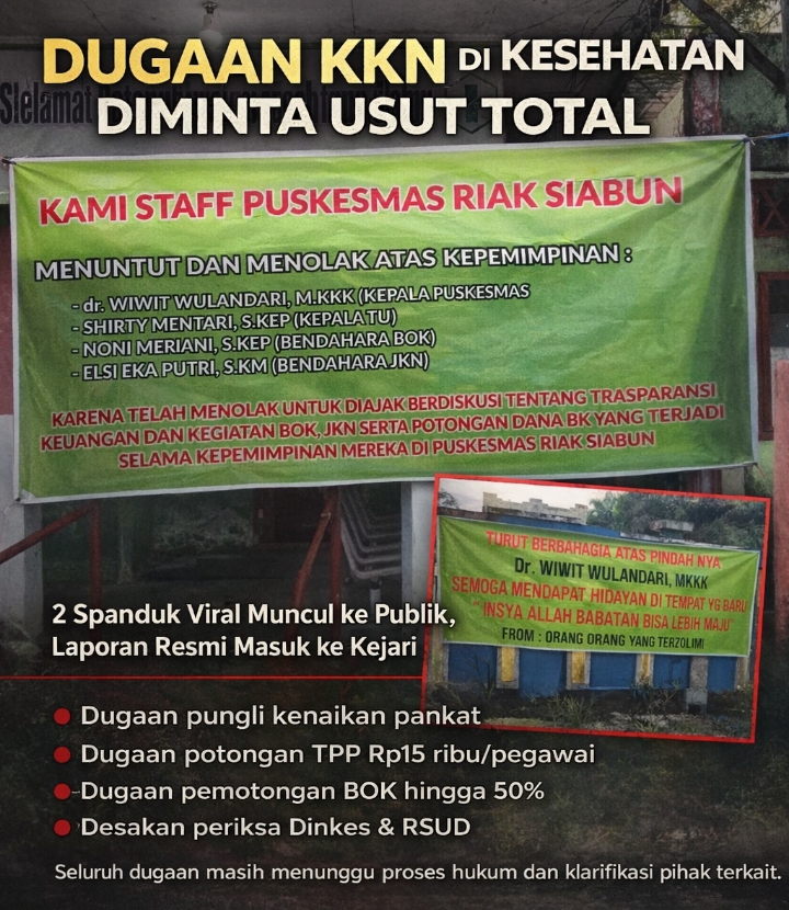 Namun demikian, belum ada keterangan resmi yang memastikan keterkaitan langsung antara isi spanduk tersebut dengan dugaan praktik yang dilaporkan di Puskesmas Riak Siabun. Dugaan tersebut masih memerlukan pembuktian serta klarifikasi dari pihak-pihak terkait.